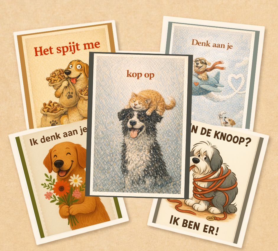 Deze set bestaat uit vijf zorgvuldig gekozen Keetjes-ansichtkaarten met een zachte toon, warme illustraties en woorden die ruimte laten voor gevoel. Niet zwaar, niet zweverig — wel oprecht, liefdevol en herkenbaar.