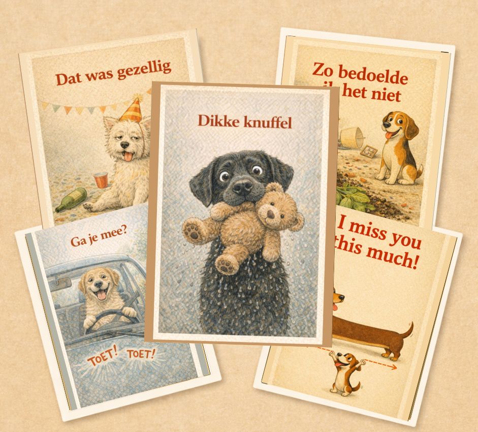 Deze set combineert vijf geliefde Keetjes-ansichtkaarten met verschillende sferen: lief, luchtig, speels en oprecht. Zo heb je voor bijna elk moment een kaart die past — zonder te hoeven zoeken.